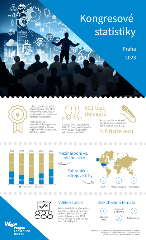 Podle nejnovějších dat si česká metropole meziročně polepšila nejen co do počtu zde konaných kongresů a konferencí ale i z hlediska počtu delegátů, kteří na tyto akce přicestovali. V roce 2023 se v Praze uskutečnilo bezmála pět tisíc odborných akcí, kterých se zúčastnilo téměř 700 tisíc osob. V mezinárodním srovnání si zároveň Praha zajistila šesté místo na žebříčku nejžádanějších kongresových destinací světa. Předčila tak i města jako Madrid, Soul, Londýn, Berlín nebo Tokio.